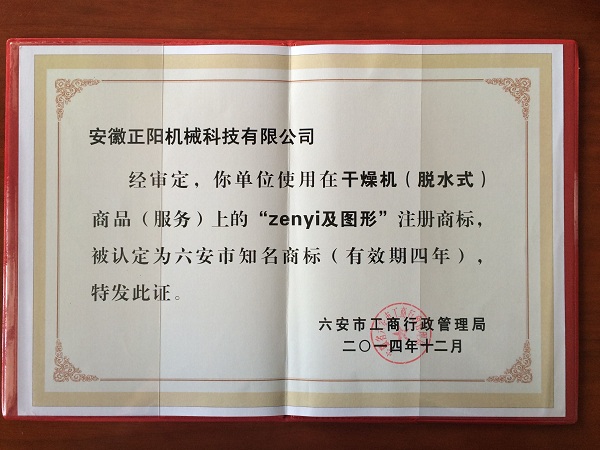 近日,安徽正陽機械科技有限公司“zenyi”牌干燥機(脫水式)商標經(jīng)過申報、評選、公示等程序,正式被六安市工商行政管理局認定為“六安市知名商標”。這是公司全體員工共同努力的結(jié)果,是六安市工商行政管理局等政府職能部門親切關(guān)懷和大力支持的結(jié)果,標志著安徽正陽機械科技有限公司在品牌化戰(zhàn)略發(fā)展道路上又前進了一大步。